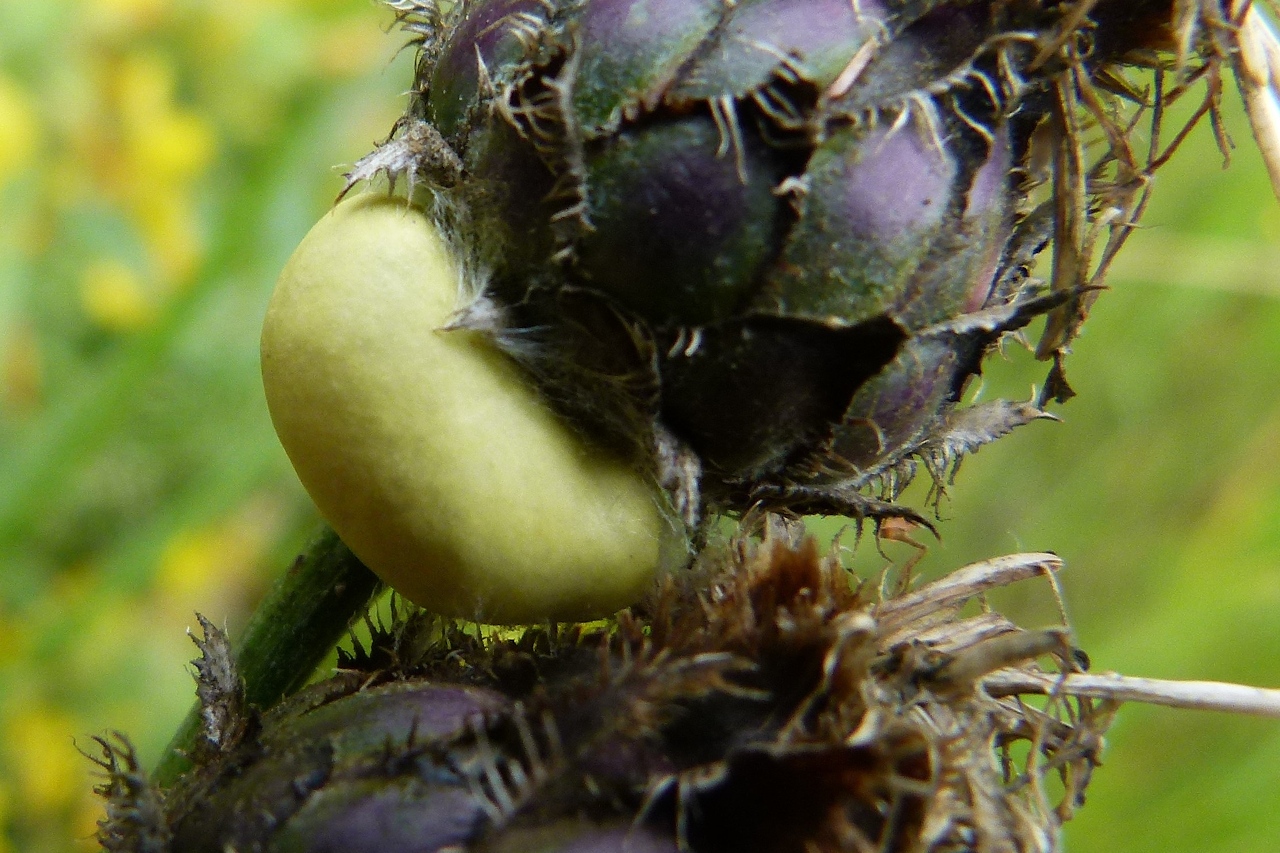 Photo prise hors Haute-Savoie, Cocon de Zygaena carniolica ; Zygène du Sainfoin (La), Zygène de la Carniole (La) ; Bramans (73), ©Photo Claudie Desjacquot